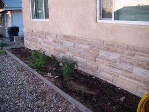 However, my yard looks a bit barren at the moment. This is what the front yard looked like last night after I cleared away the trash and weeds. Some of my flowers from last year are coming back up this year. YAY! I love it when something green (other than weeds) comes up on its own! Anything green is a big deal in the desert. So here’s the front flower bed with the few lil green things that decided to grow. Alongwith the river rock that was put in the “landscape” the front yard.