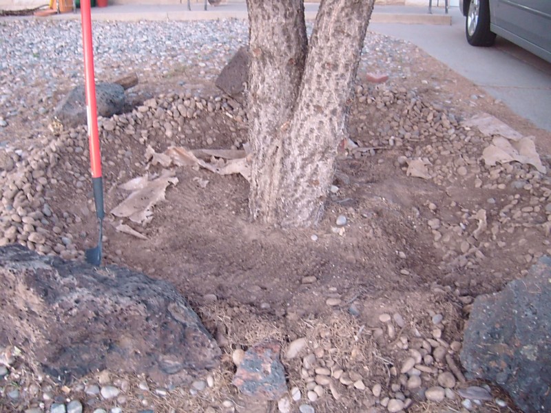 And my BEAUTIFUL Pinon tree, unfortunately, when the previous owners had the front yard landscaped with river rock, they also put down PLASTIC weed barrier. Which is great if you are trying to keep a barrier between you and the weeds, but bad when you are trying to grow a pretty tree. Here is my tree after I scraped most of the river rock and plastic weed barrier away from the base to let her roots get some much needed air and water. Now my pretty tree can BREATHE! I just know she wiggled her toes when the last of the plastic barrier was removed.