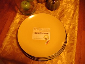 Then we have my Corelle Hearthstone plates. I loved them because they had a nice heavy weight to them and they were yellow! I just couldn’t pass them up, especially at $3  a plate! I picked up 4 of them, so,  for a grand total of $12 I now have some pretty plates to set out for my fall meals. Aren’t they the perfect color for it?! They are yellow on top and black on the bottom. The yellow keeps them cheery enough to use on a summer table too.
