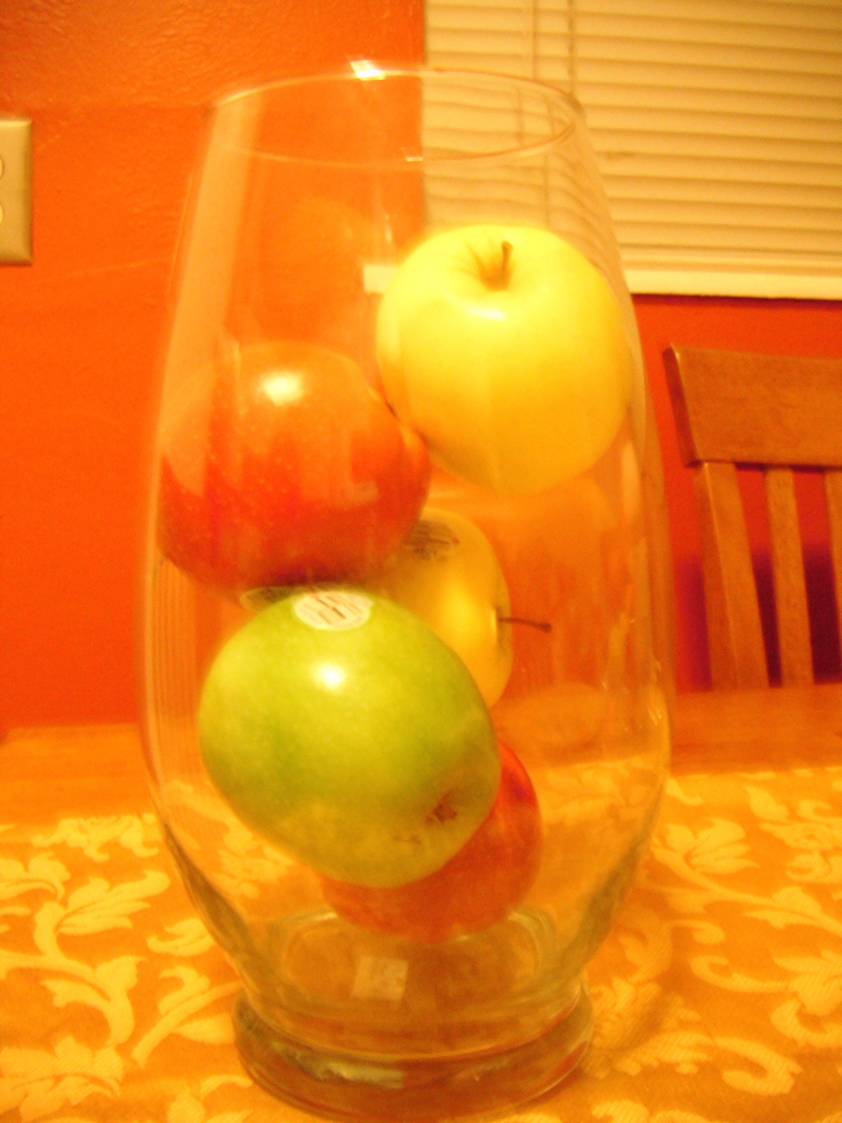 I probably should have removed the stickers from the apples before shooting this picture, but I guess that’s just keepin’ it real!  Actually, I ended up with two of these pretty vases, and will probably use them as center pieces in an upcoming event. By the way this event I am referring to is my wedding. Calling it an event seems to be a lot less stress inducing than calling it a wedding! So, after the “event”, I can use these pretty vases for so many different uses. At Christmas time I can put some pretty glass balls in them, at Valentines Day something pretty pink and red, at Easter time some sweet looking wooden eggs. The possibilities are endless.