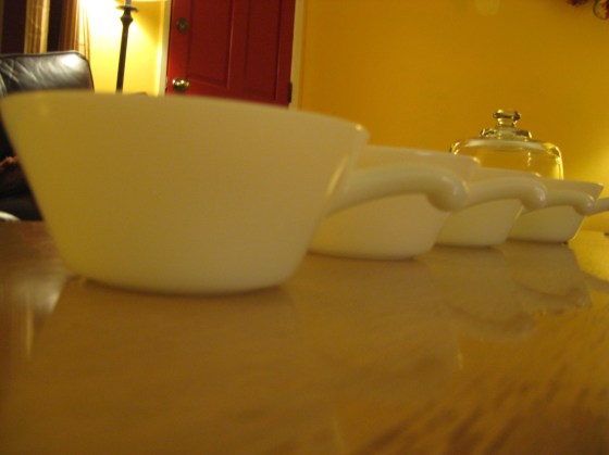 These beauties are from Anchor Hocking, and according to e-bay and other “reliable” sites, they could be from the late 1940’s to the mid 1970’s. I have a hunch they are the ’70’s variety. But aren’t they cute with their little handles? And at .59 a piece I just couldn’t pass them up. They are perfect for that late night bowl of Lucky Charms , not too little but not too much. However my jeans would say otherwise.