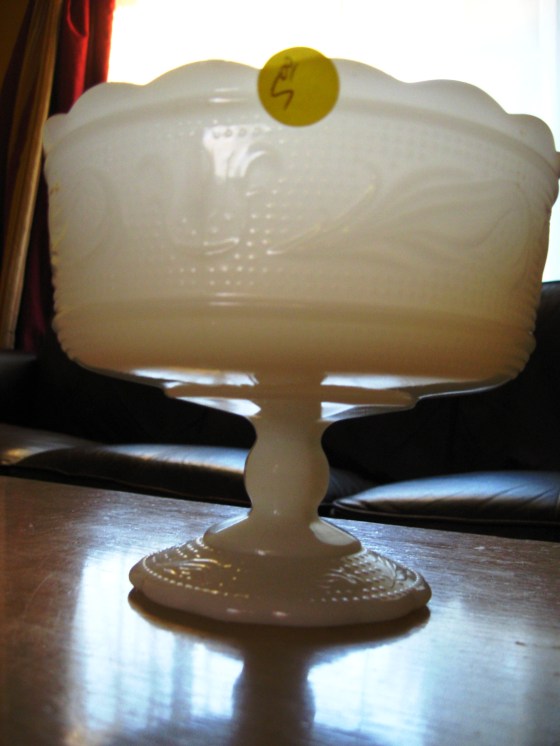 Have I mentioned how much I love milk glass? Well, I really love milk glass and I seem to be building quite a collection of it. This candy dish was too pretty to pass up. At $5 it seemed a little high to me, but I loved it too much to put it back down. And so, it sits on our coffee table, looking pretty, I even put some Christmas peppermint in it. So Christmas-y!