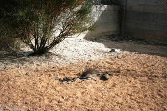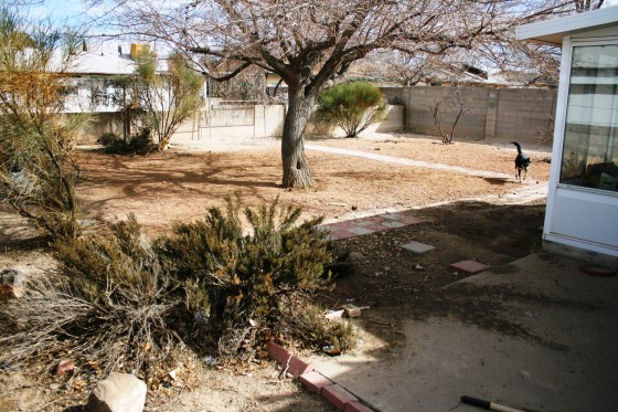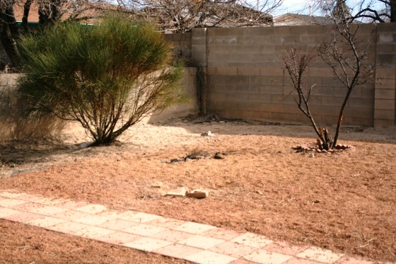 Anywho, moving on…Bubba and I are hoping to rip out the nearly non-existant gravel with underlying “weed barrier” and attempt to plant grass. I say attempt, because here in the Southwest we are all on some pretty tight water restrictions. Plus, the soil is pretty sandy, I’m not sure if seed will even be able to root in the stuff. It will take come extensive conditioning to make the dirt grass friendly.