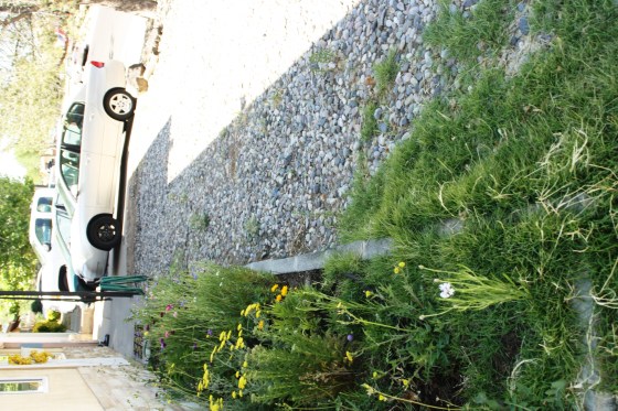 Ignore the weed grass, that’s the cowlick of my front yard. And my car usually has a hubcap, Bubba was working on the brakes, stopping is a good thing! Oh, and notice the purple bachelor buttons!