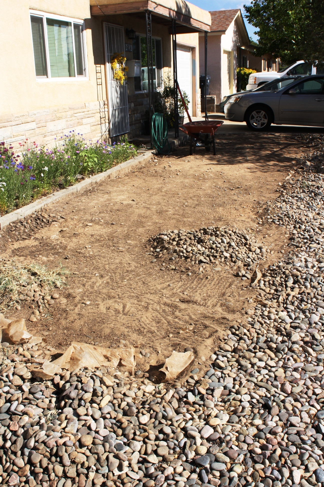 The plan, to seed or sod or possibly cover with wood mulch, the dirt rectangle by the front porch and flower bed. And to place left over crusher fine for the path. Painting of the porch and garage border will come soon after all the heavy work has been completed. Stay tuned for my big reveal!