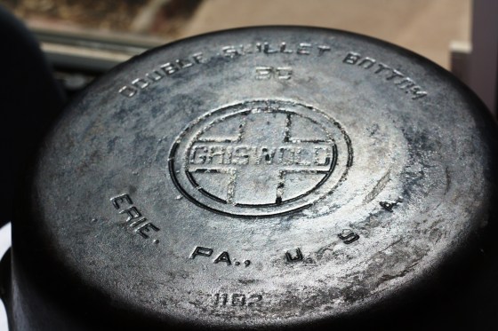 According to this site our skillet could be from 1940’s or later. And apparently, it’s not considered “good” metal since the Griswold is not in italic letters. After 1940, diminished metal was used to make cast iron pots, and Griswold stopped italicizing it’s name within the cross after that point. But again, I’m not an expert on cast iron, I just like old stuff and history. This little skillet wasn’t purchased for it’s monetary value, it was merely purchased for it’s unique quality.