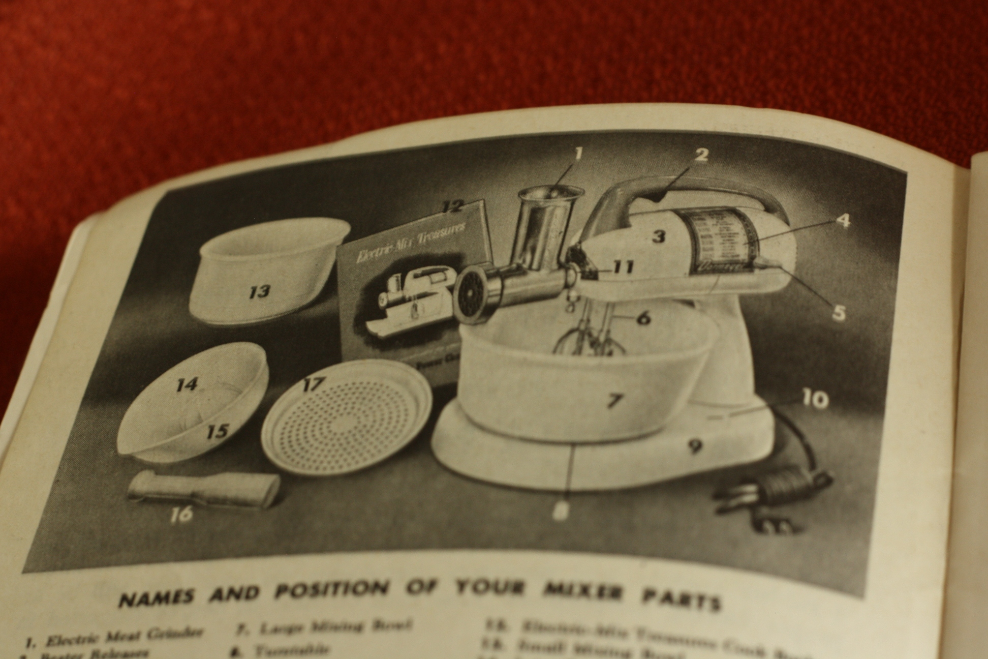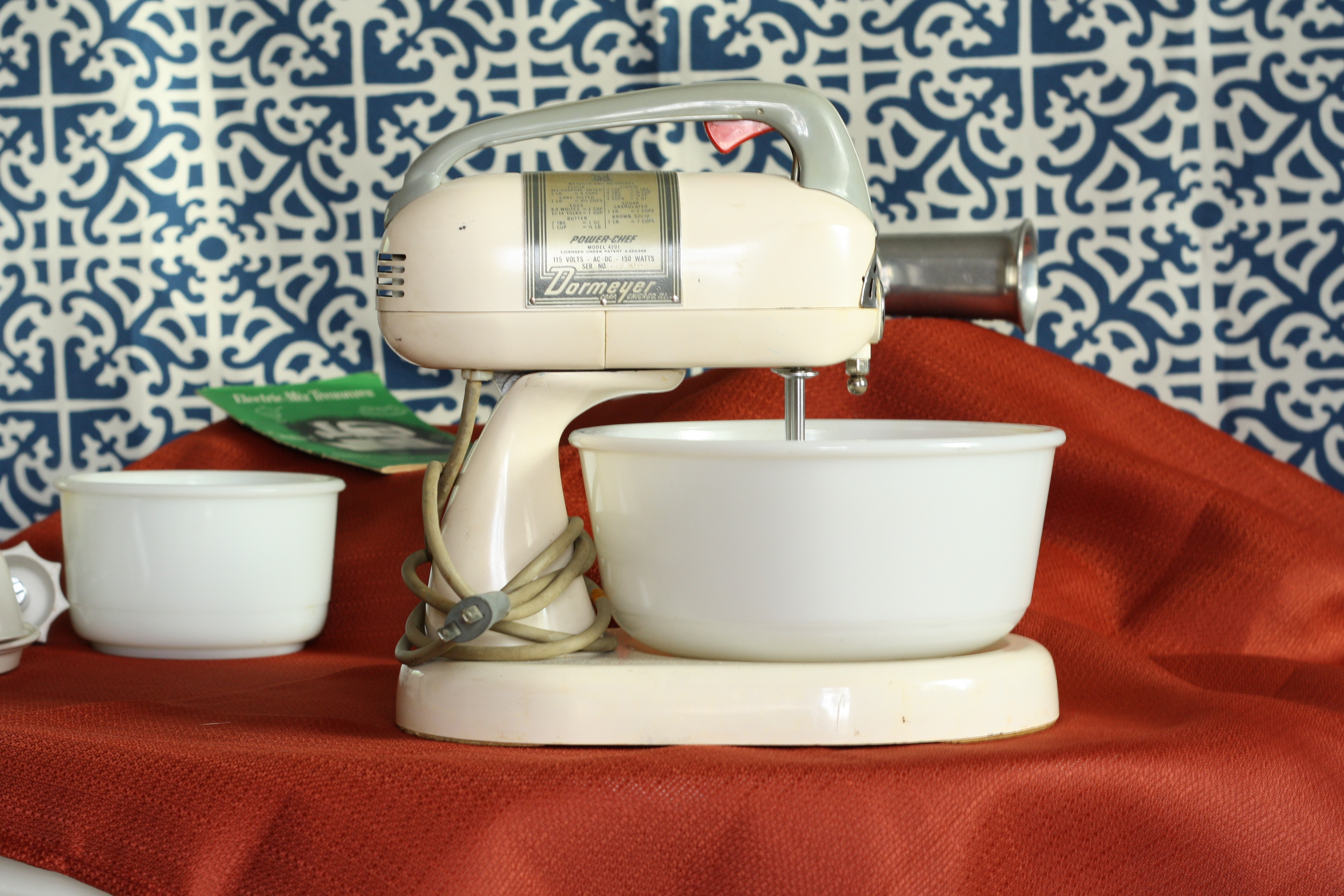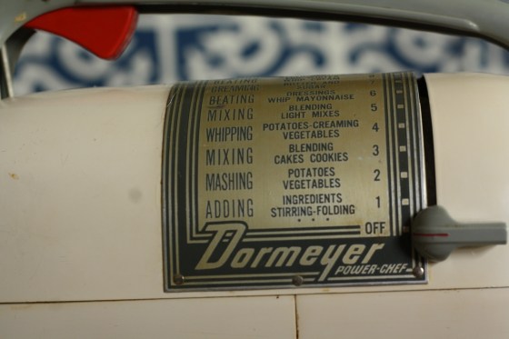 Sorry to get your hopes up, it’s just a mixer, not the rapper. But it’s a pretty cool mixer if you ask me. Last weekend I purchased the 4200 Dormeyer mixer for $5, with all original parts and the manual, including the milk glass mixing bowls which is what drew me in. It was a deal I could NOT pass up. And it works! I tried it out the other day and didn’t burn down the house! WOO-HOO! A thousand points for not having to meet the fire department yet again!