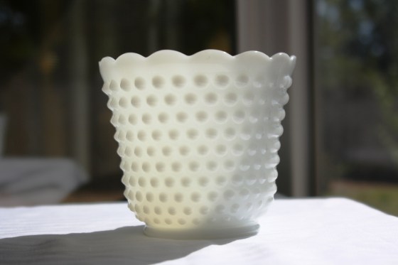 As I had mentioned in a previous post, I’ve got quite the addiction to milk glass items. Especially when it comes to milk glass vases of various shapes and sizes. My favorite at the moment is a hob nail vase…