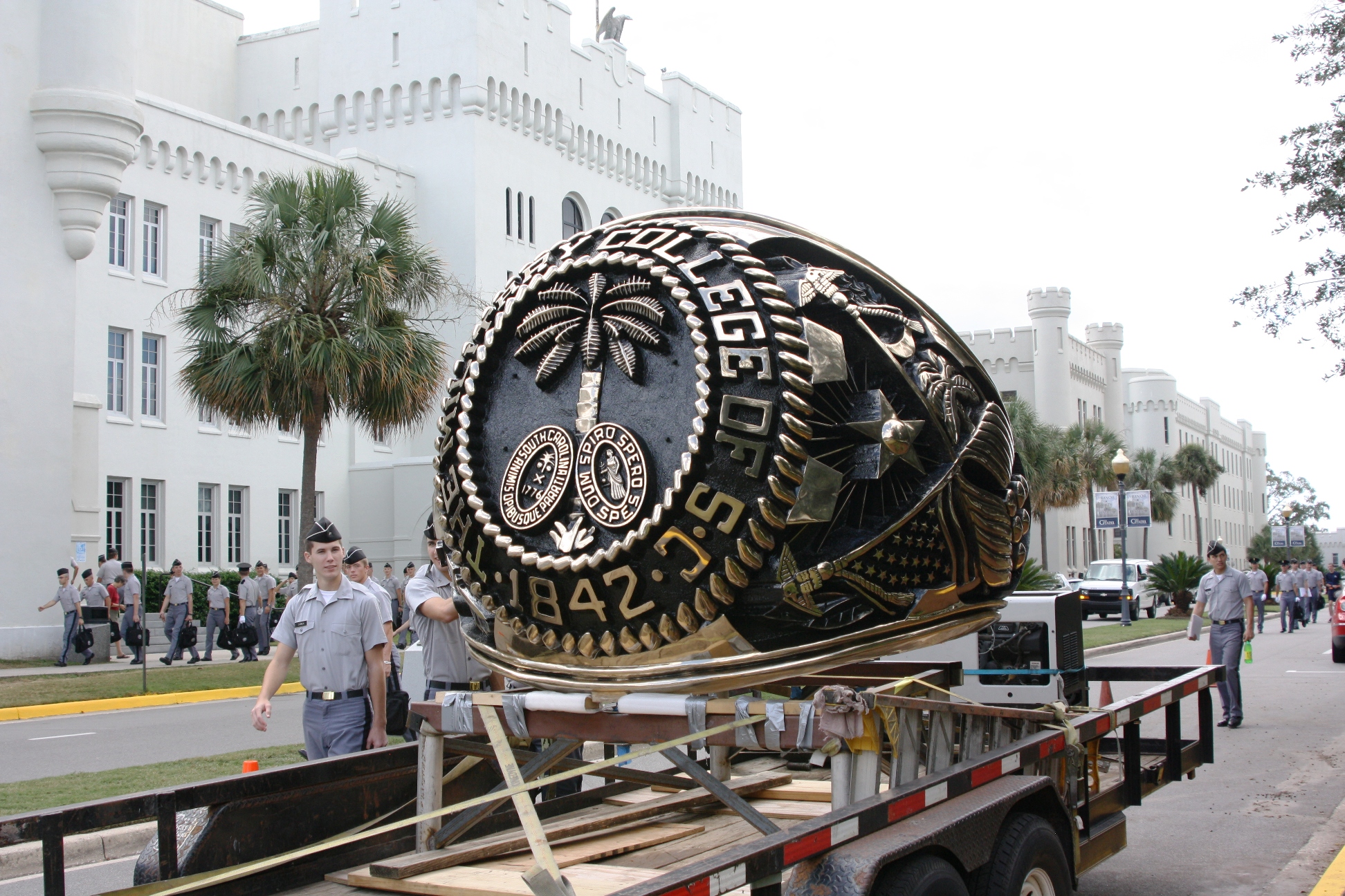 Yes, it’s a giant class ring. I’m not sure who donated it, but I do know that it was made out of the same materials as the actual rings that the cadets receive. The giant ring has a place of honor right at the entrance of the Citadel. See those empty spaces where a year would go? Those will be changed out whenever they have a graduation or a special former cadet pays a visit to his or her alma mater.