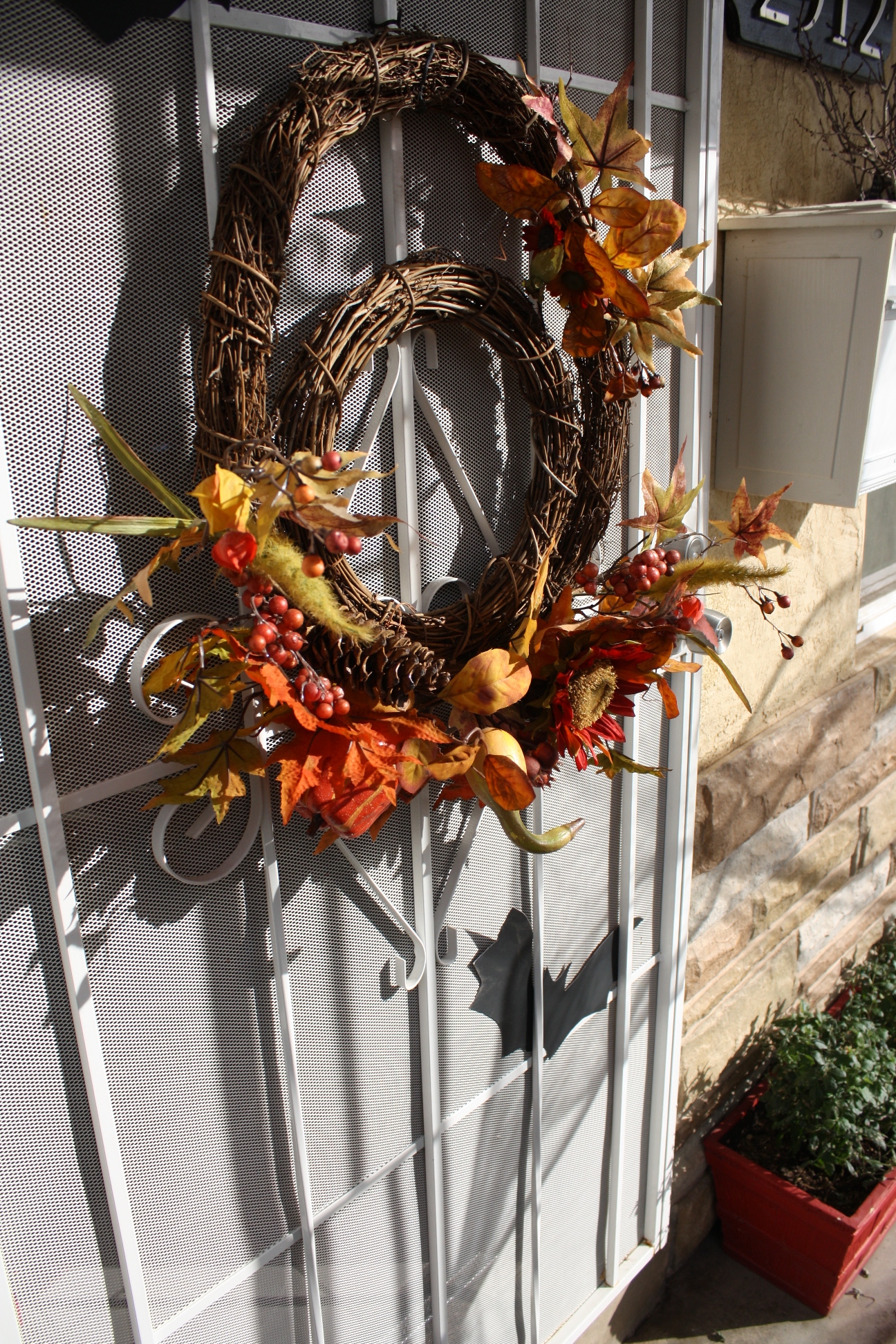 The harvest pretties generally stay up from September till after Thanksgiving, so they are usually more substantial than poster board bats and fake cobwebs from last year. But the bats go well with my wreath no?