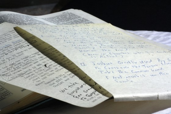 Amongst the pages of this Bible are several of Dad’s sermon outlines, some are handwritten, some were typed on an old typewriter, others were scrawled on scrapes of paper here and there as the Lord spoke to my dad.   The Bible is a cherished possession, not only because it’s the Word of my Savior, but also because it holds much of who my dad was on this earth. These sermon outlines, do not paint the entire picture of who Dad was, but they do remind me of what Dad represented, and what I hope to represent to this world.
