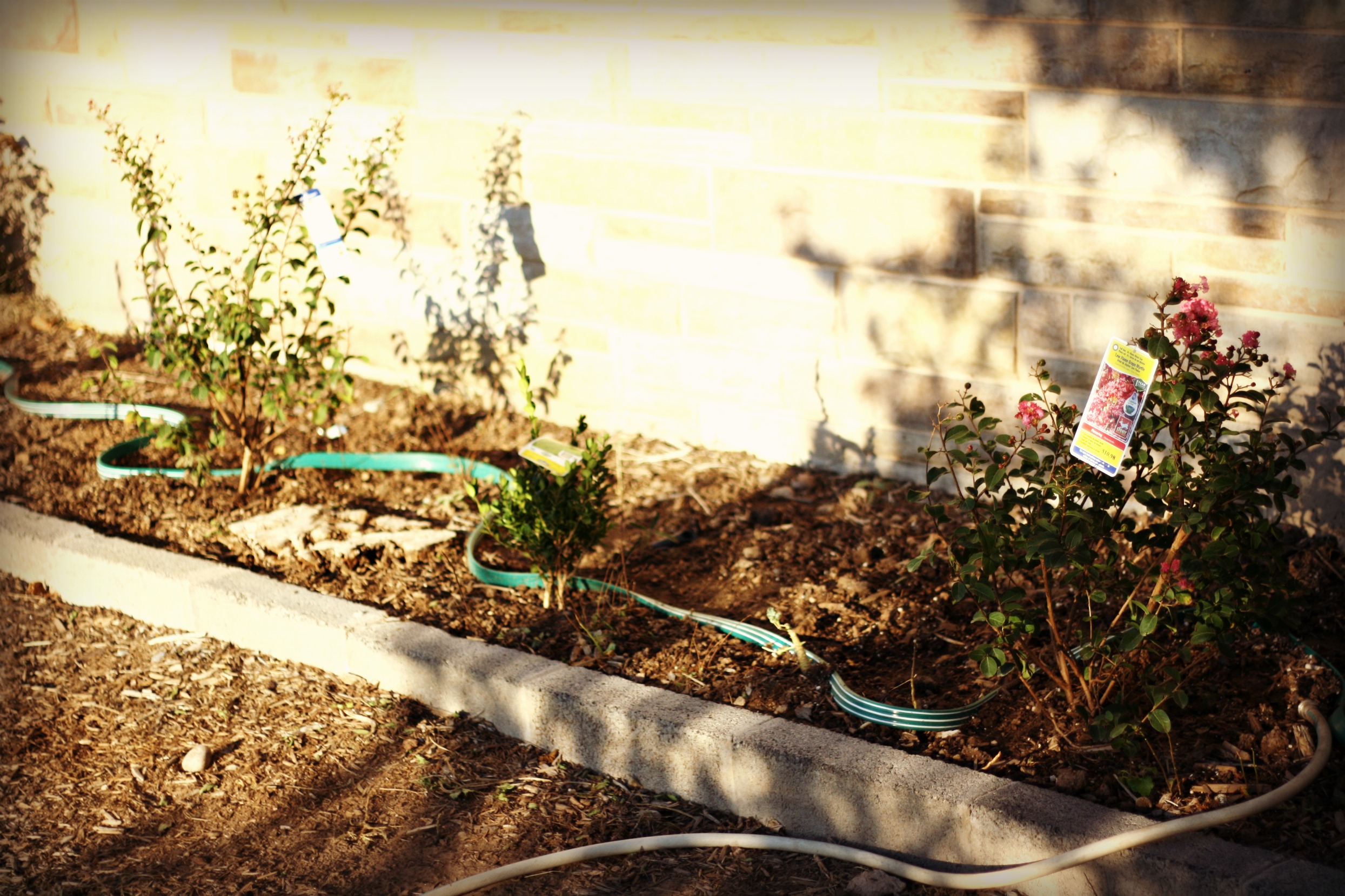 Actually, it was a water line 3 inches below the surface. Why they put a waterline right smack in the middle of a flower bed and at such a shallow depth is beyond me. All I knew was that this posed a slight problem, and I had to change my layout slightly. And when I say change my layout, I mean digging all of my holes three inches closer to the outside edge of the flower bed.  Hopefully, the roots of the my new sticks won’t cause problems with this water line down the road. I guess only time will tell. But in the mean time, this is what the front yard is looking like now.