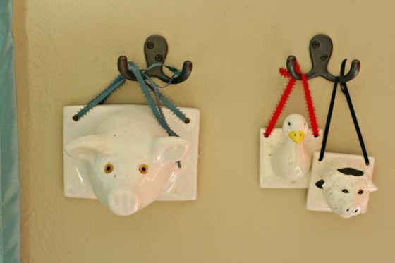 Apparently, I have something for farm animal heads, I found the three of these at Goodwill a few months back with the ribbons already attached, I just hung them on the old dog leash hooks. Oh, and remember, the big pig head I was so proud of?