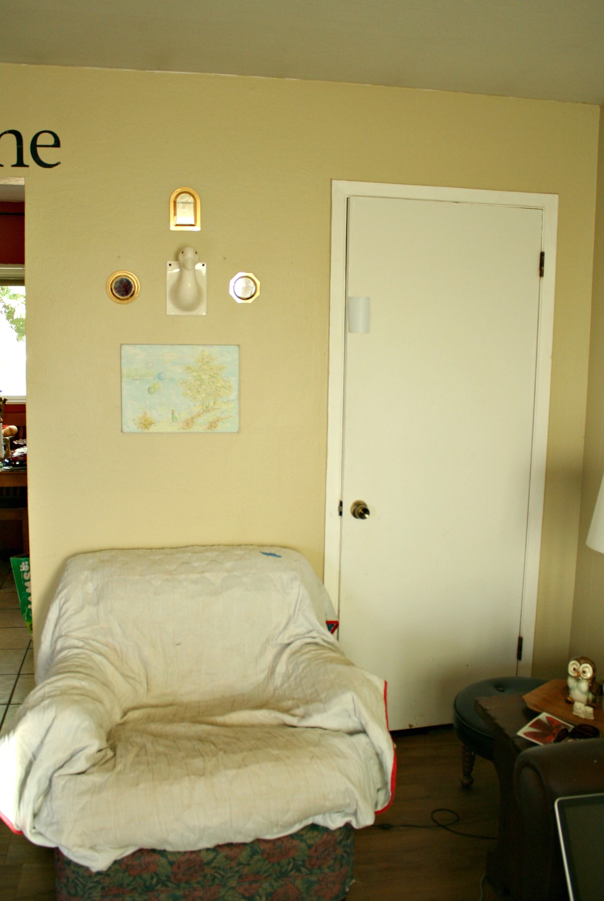 She may seem silly, but her smiling face makes me smile right back. I think she was originally meant to hang in a kitchen and hold aprons and towels and other kitchen hang-y things. But I hung her up in my living room, right above Goldie’s chair.