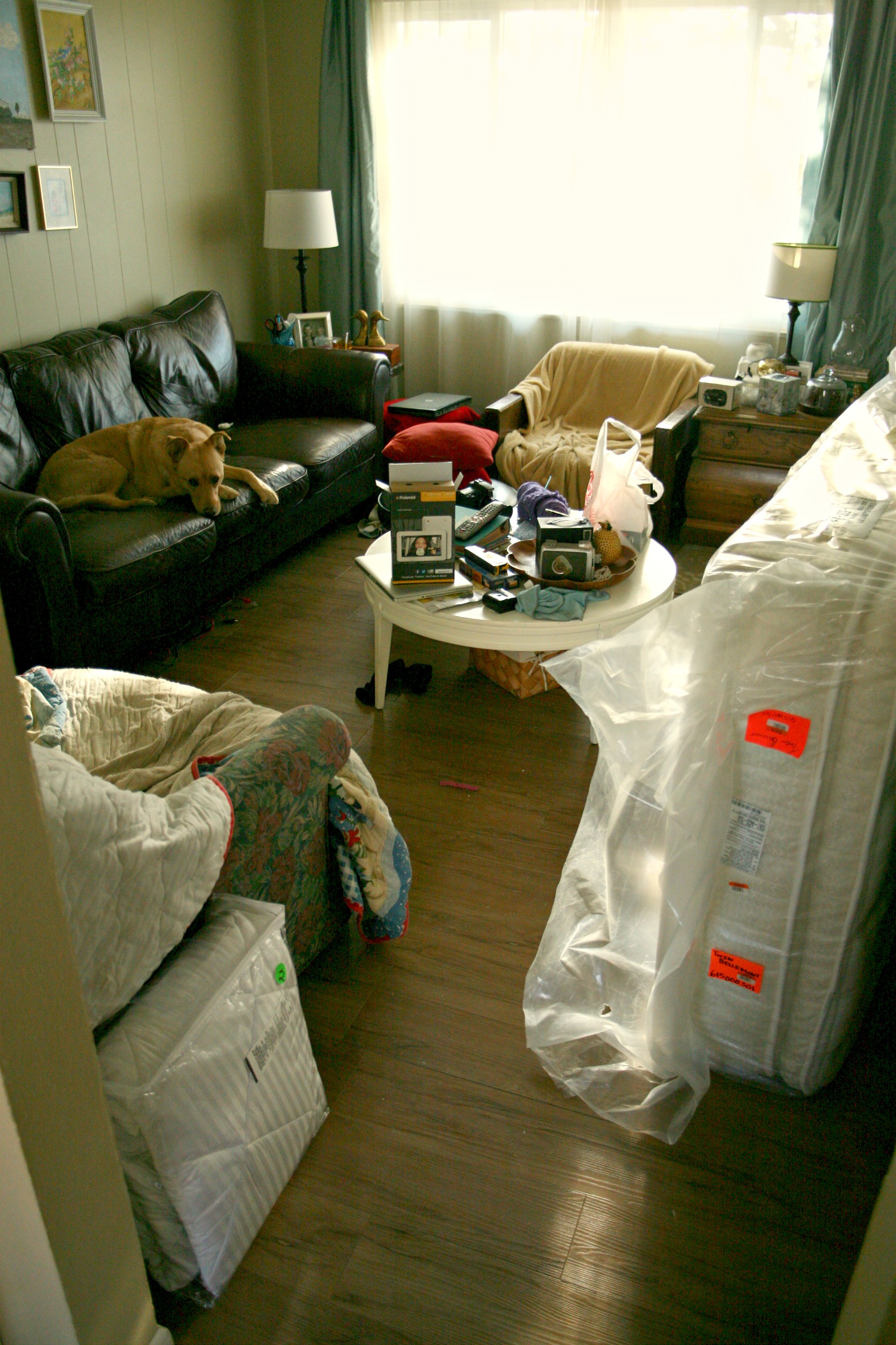 Reorganizing, our storage room or what others may call a spare room had to get cleaned out and fast for a special guest (Hi Mom!). Isn’t it crazy how much chaos occurs before the order can begin? And yes, that’s a twin mattress in my living room, blocking my TV. What better motivation to get things done than by blocking ones television.
