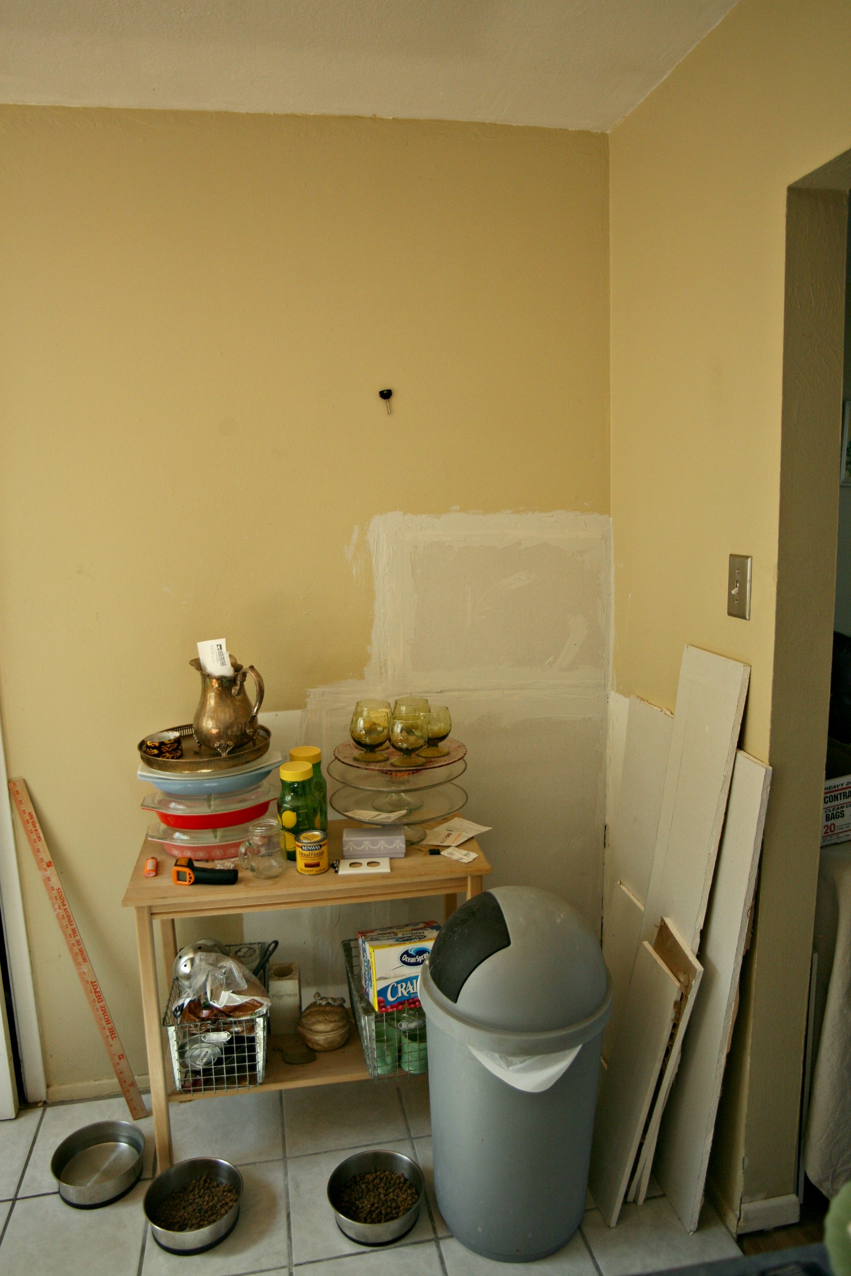 I seem to have misplaced the memory card that held any before shots, but this is in my kitchen, the wall between the kitchen, utility room, and a small coat closet. Previously, there had been a cabinet in this space, hence the white outline of said cabinet. That’s really how this all started out, I wanted to move the cabinet that we dubbed the “buffet”, which is little more than a cheap free standing piece of cabinetry one finds at Home Depot, to the other side of the stove which currently had only one 3 ft section of counter space adjacent. This would be so much easier if I could illustrate with photos.