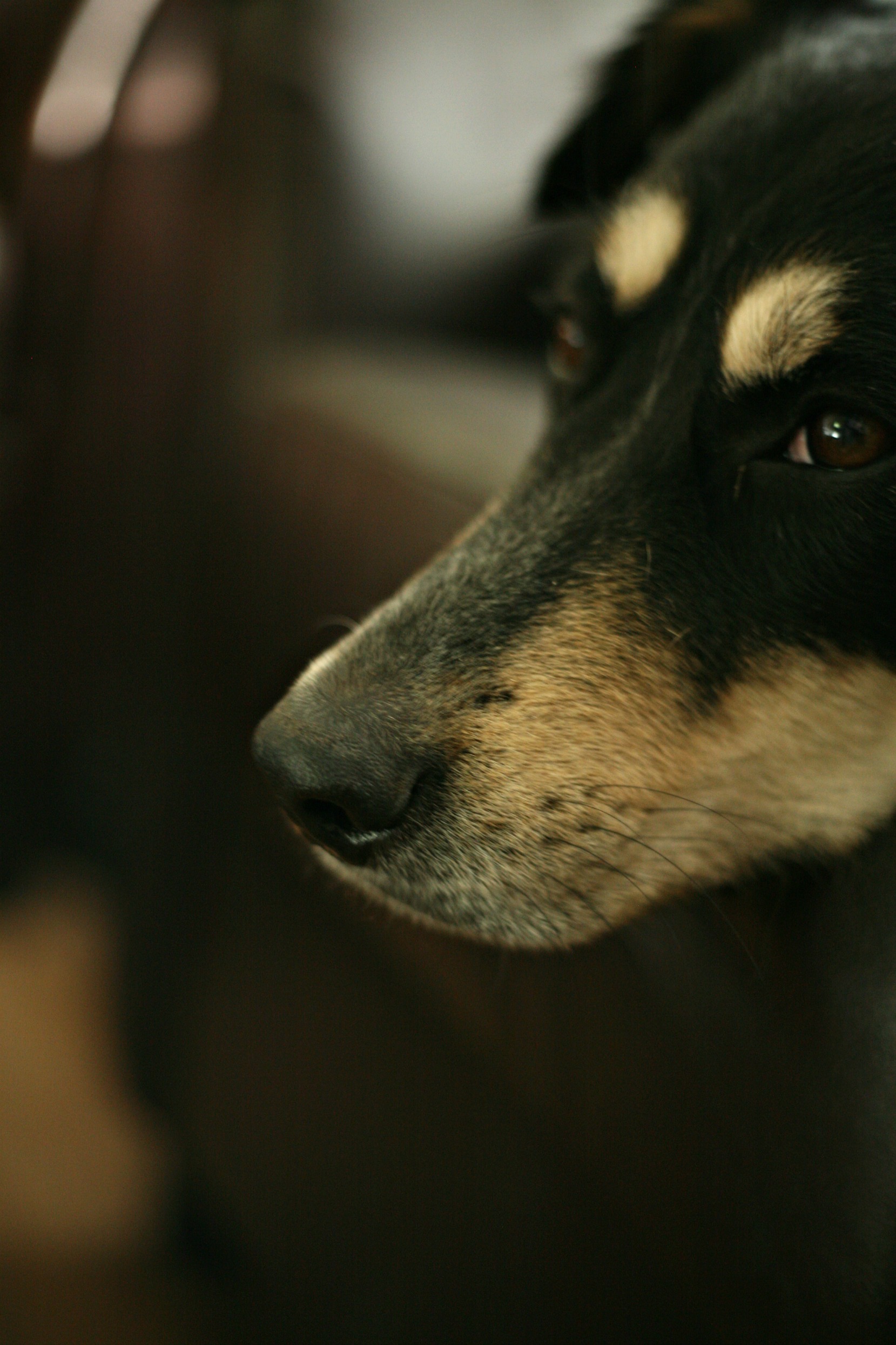 Notice, how my models ear is in focus while the area around the ear is slightly blurred. And in the photo below, the other model has a very focused nose (better for sniffing out rawhides), but the background is blurred.