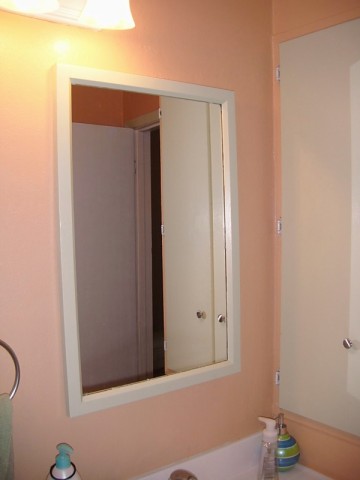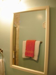 I repainted the old bathroom mirror, which was formerly the same color as the ugly minty green trim. Now it’s a creamy Vanilla Bean color. I seem to be referring to paint colors in icecream terms, it might be an icecream for dinner night tonight.