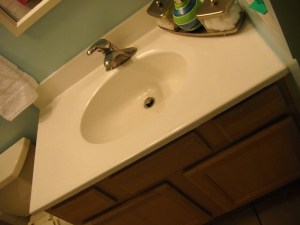 Here you can see that the previous owners accented the awful peach with minty green. You can also see the cluttered state that my bathroom is usually in. I can honestly say after scrubbing and painting this bathroom, I am permantly cured of my addiction to Blue Bell Mint Chocolate Chip Icecream. Let’s just hope I never see any fuzzy bathroom walls painted in Pecan Praline!