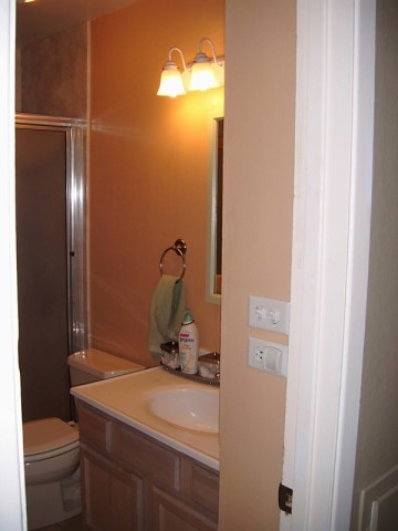 Believe me, it definitely looks better on my bathroom walls with nice brushed nickel fixtures than the kitchen above. Here are some pics of what she looked like before the paint went up…